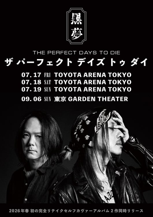 黒夢が東京・TOYOTA ARENA TOKYO、東京ガーデンシアターでライブイベント「THE PERFECT DAYS TO DIE -ザ パーフェクト デイズ トゥ ダイ-」を開催することと、春に完全リテイクセルフカバーアルバム(タイトル未定)をリリースすることを発表した。