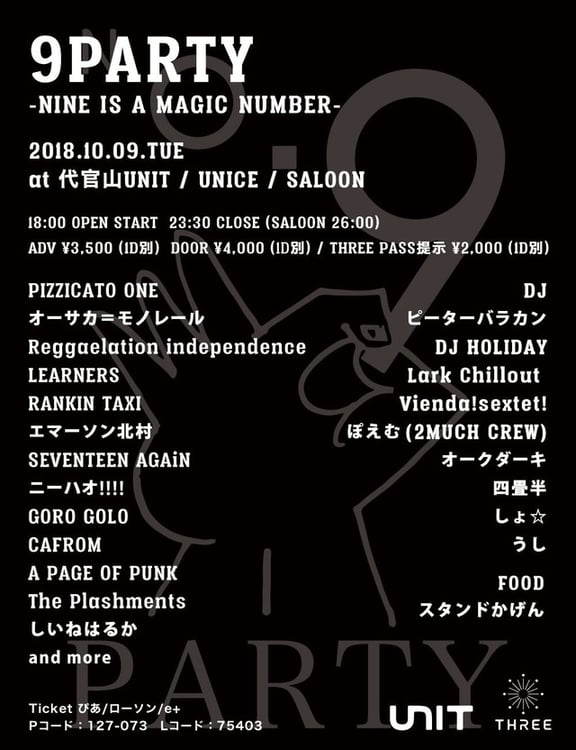 東京・下北沢THREEにて毎月9日に行われているイベント「9PARTY -NINE IS A MAGIC NUMBER-」の拡大版が、10月9日に東京・UNIT、UNICE、SALOONにて開催される。