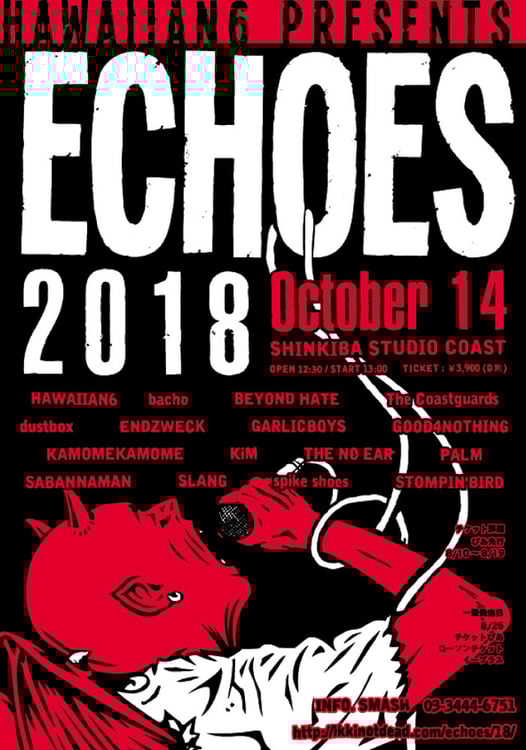 HAWAIIAN6が10月14日に東京・新木場STUDIO COASTにて開催するライブイベント「ECHOES 2018」。本イベントの出演アーティスト第1弾が発表された。