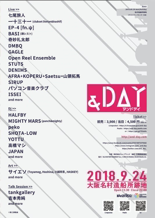 LIVE:七尾旅人 / 一十三十一(Dorian&kashif) / EP-4 [fn.ψ] / BASI(韻シスト) / 奇妙礼太郎 / DMBQ / GAGLE / Open Reel Ensemble / DENIMS / SIRUP / AFRA+KOPERU+Saetsu+山領拓馬(Day tripper、APSET) / パソコン音楽クラブ / ISSEI / HALFBY MIGHTY MARS(punch&mighty) / peko / SHOTA-LOW / YOTTU / and more