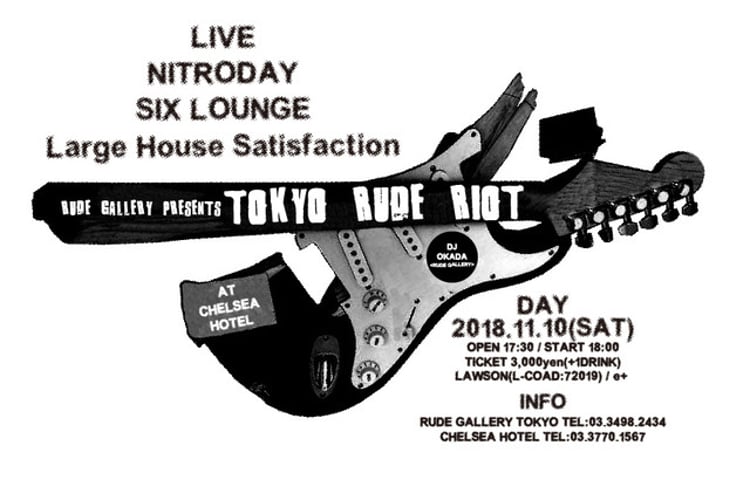 昨年12月にも同会場で行われた「TOKYO RUDE RIOT」。今回はライブアクトとしてSIX LOUNGE、Large House Satisfaction、ニトロデイ、DJとしてOKADA(RUDE GALLERY)が出演する。チケットは8月25日に東京・RUDE GALLERY TOKYO店頭、9月9日にローソンチケット、イープラスにて販売される。