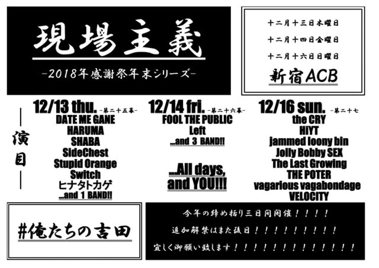 これは新鋭バンドが多く出演するライブイベント「現場主義」の“年末シリーズ”として行われるもの。現時点で13日にHARUMA、SideChestら7組、14日にFOOL THE PUBLICとLeft、16日にvagarious vagabondage 、VELOCITYら8組の出演が決定しており、13日と14日の公演にはさらに出演者が追加される。