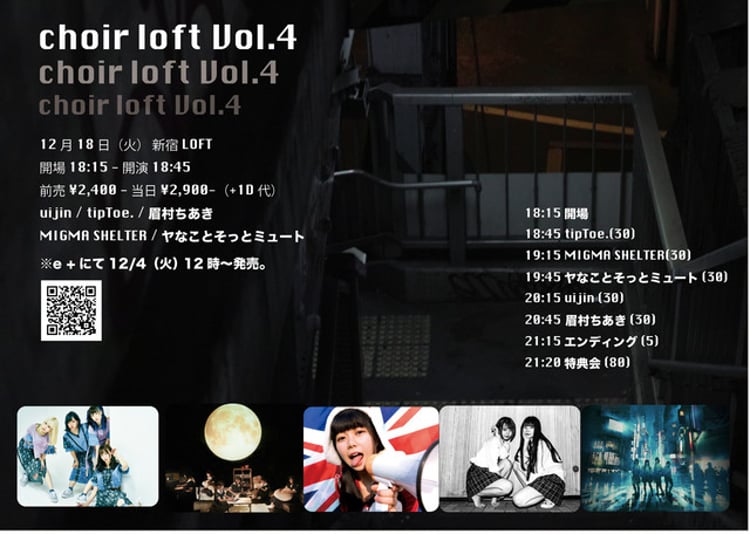 「choir loft」はEdenhall Inc.が主催するイベント。12月18日に行われる「choir loft Vol.4」にはuijin、tipToe. 、眉村ちあき、MIGMA SHELTER、ヤなことそっとミュートが出演。一方、1月16日に行われる「choir loft Vol.5」では、amiinA、THERE THERE THERES、tipToe.、虹のコンキスタドール、MELLOW MELLOWがライブを行う。「choir loft Vol.4」のチケットは12月4日12:00、「choir loft Vol.5」のチケットは12月8日10:00にイープラスで発売される。