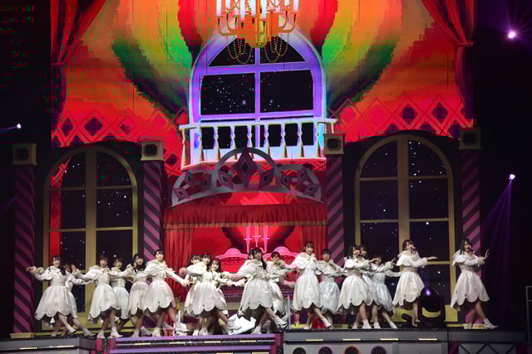 クリスマスムード満点の映像演出が終わると、ライブはユニット曲のコーナーへ。まずは金村美玖、富田鈴花、松田好花がユニット曲「線香花火が消えるまで」をトロッコに乗って歌い、会場を盛り上げた。続いて登場した柿崎と佐々木美玲はアリーナの左右に設けられたリフターに乗り、「三輪車に乗りたい」を歌唱。リフターは地上8mの高さまで上がり、2人はスタンド上層部の観客まで歌声を届けた。潮、加藤史帆、齊藤京子、久美、高本彩花はレトロな雰囲気の衣装に着替えて「沈黙した恋人よ」を可憐に披露。美玲はステージ上部に吊るされた三日月型のオブジェに座って「わずかな光」を熱唱した。