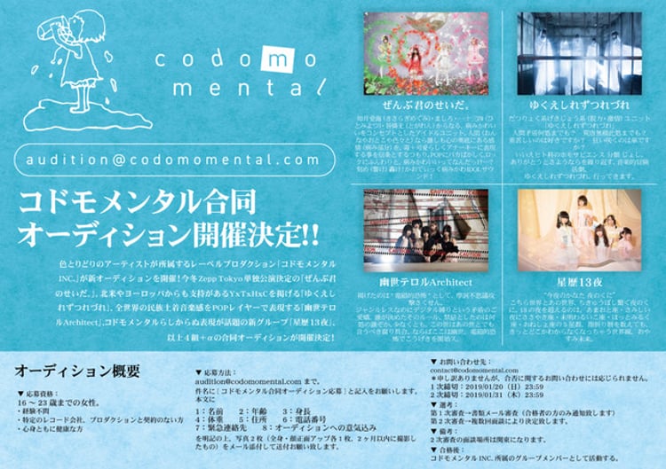 今回新メンバーを募集するのはぜんぶ君のせいだ。、ゆくえしれずつれづれ、幽世テロルArchitect、星歴13夜の4組“+α”とのこと。応募資格は特定のレコード会社やプロダクションと契約のない、心身ともに健康な16歳から23歳の女性で、書類審査と面談を経ての合格者は各ユニットの新メンバーとして活動する。書類審査の1次締切は1月20日。