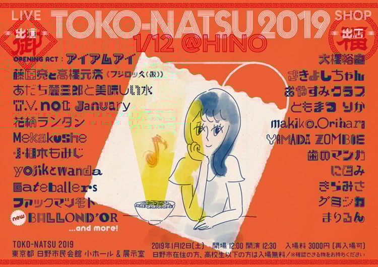 昨年4月には“温泉ニュースタイル宴会”イベント「湯会」とのコラボ形式で開催された「TOKO-NATSU」。今回はライブアクトにアイアムアイ、あだち麗三郎と美味しい水、T.V.not january、藤原亮と高橋元希(フジロッ久(仮))、花柄ランタン、mekakushe、小棚木もみじ、yojikとwanda、Gateballers、ファックマツモト、BALLOND'OR、おやすみホログラムを迎える。会場には予約なしで入場でき、東京・日野市在住もしくは高校生以下の人は証明書を持参するとチケット代が無料となる。