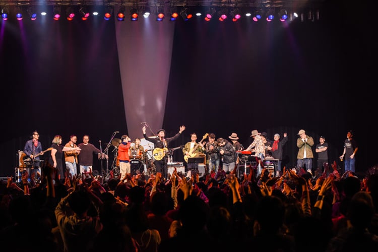 ラストを飾るORIGINAL LOVEのステージをサポートするのは、木暮晋也(G / ヒックスヴィル)、村田シゲ(B / □□□、CUBISMO GRAFICO FIVE、Circle Darko)、小松シゲル(Dr / NONA REEVES)、冨田謙(Key)、真城めぐみ(Cho / ヒックスヴィル、ましまろ、HEA)というおなじみの面々。6人は2月13日にリリースされるORIGINAL LOVEのニューアルバム「bless You!」の収録曲をふんだんに盛り込んだセットリストでライブを繰り広げた。キーボードの音色を基調とした「冗談」で田島が柔らかなファルセットボイスやけだるげな歌声を操ったあと、6人は清涼感のある「ゼロセット」、複雑なリズムが絡み合う「AIジョーのブルース」と新曲を届けてオーディエンスを喜ばせる。初披露となった「グッディガール」ではコラボ相手のPUNPEEが登場。アダルトな雰囲気の漂うサウンドに乗せ、艶のあるラップを繰り出した。続く「ラヴァーマン」で観客のハンドクラップが巻き起こり、場内がピースフルなムードで満たされる中、こちらも初披露となった「bless You!」で演目はすべて終了。この日の出演者がステージに勢ぞろいし、イベントはフィナーレを迎えた。なお終演後にはORIGINAL LOVEが6月から7月にかけて全国ツアー「ORIGINAL LOVE "bless You!" Tour」を開催することが発表された。