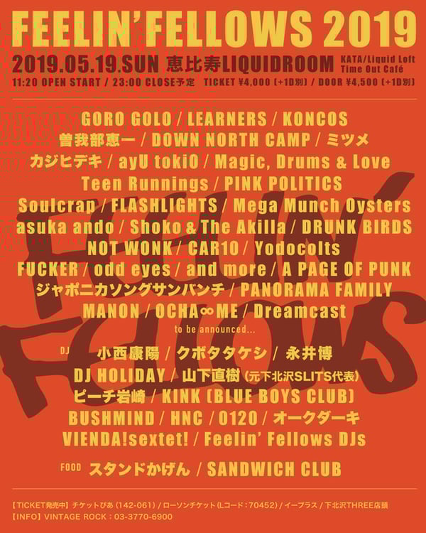 このイベントは東京・下北沢THREEの店長であるスガナミユウを中心に開催されているレギュラーイベント「FEELIN'FELLOWS」の拡大版。このたび出演者としてカジヒデキ、ayU tokiO、CAR10ら22組が追加された。チケットは各プレイガイドおよび下北沢THREEにて発売中。