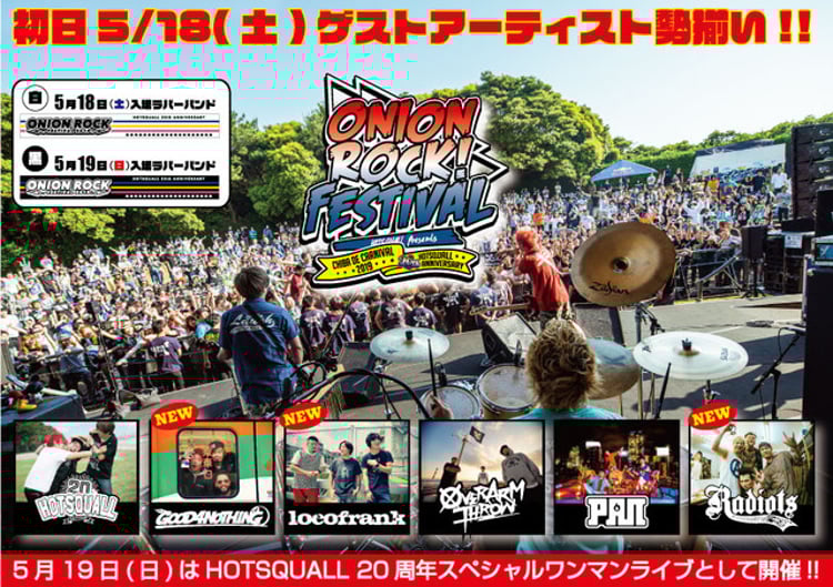 5月18、19日に千葉・稲毛海浜公園 野外音楽堂にて行われるHOTSQUALL主催のライブイベント「ONION ROCK FESTIVAL 2019」。本イベントの初日公演の追加ゲストアーティストが発表された。