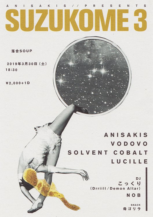 昨年6月に同会場で第1回が開催された「SUZUKOME」。3度目となる今回はライブアクトとしてANISAKISのほかVODOVO、SOLVENT COBALT、LUCILLE、DJアクトとしてこっくり(Drriill、Demon Altar)、NOBが出演する。