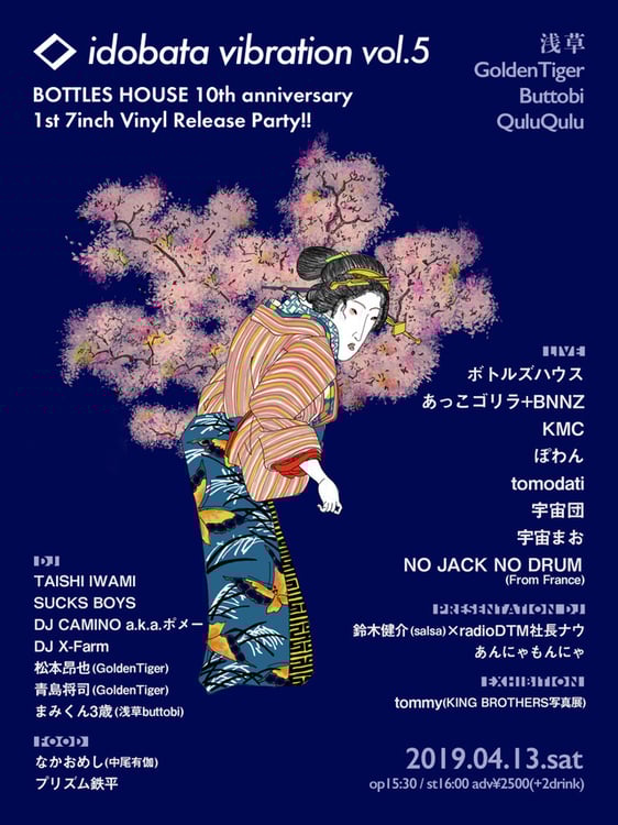 活動10周年を迎えたボトルズハウス主催のサーキットイベント「idobata vibration vol.5」が、4月13日に東京・浅草ゴールデンタイガー、浅草Buttobi、浅草QuluQuluで開催される。