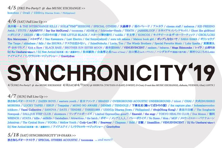また5月18日に大阪・服部緑地野外音楽堂で開催されるイベント「SYNCHRONICITY'19 OSAKA」の詳細も決定。出演アーティスト第1弾として渋さ知らズオーケストラ、SPECIAL OTHERS ACOUSTIC、toconomaがアナウンスされている。イープラスでは本日3月14日から4月5日23:59までチケットの先着先行予約を受付中。一般販売は各プレイガイドにて4月6日から。