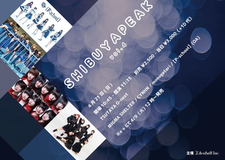 「SHIBUYA PEAK」はEdenhall Inc.が主催する企画。イベントには、MIGMA SHELTER、CYNHN、monogatariに加えて、オープニングアクトとしてブルーハーツをカバーするアイドルグループ・【P-school】が出演する。チケットはイープラスで4月9日12:00に発売される。