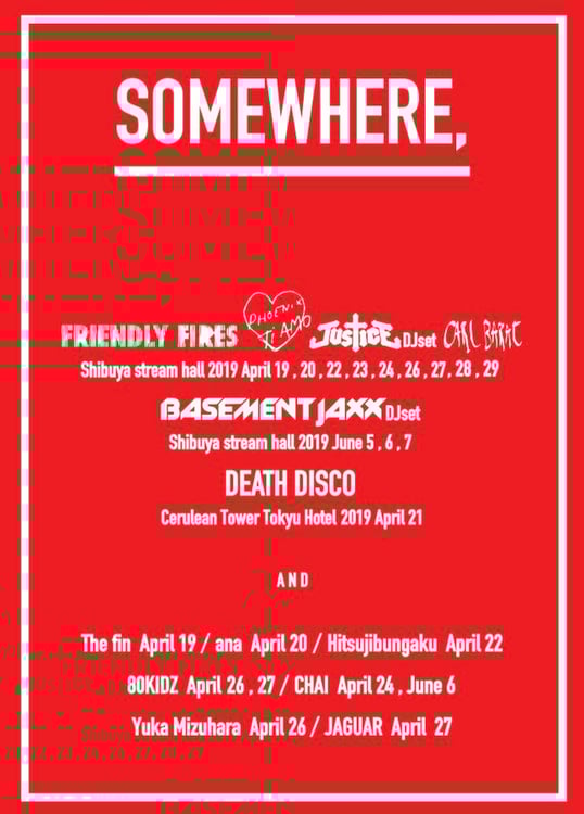 「SOMEWHERE,」は海外アクトのライブやDJ、映画上映など、さまざまなプログラムが催される国際音楽祭。The fin.は4月19日、アナは20日、羊文学は21日にそれぞれPhoenixのオープニングアクトとして出演する。この発表で既発のCHAI、80KIDZ、水原佑果 、JAGUARと併せて計7組の国内アーティストがラインナップされた。