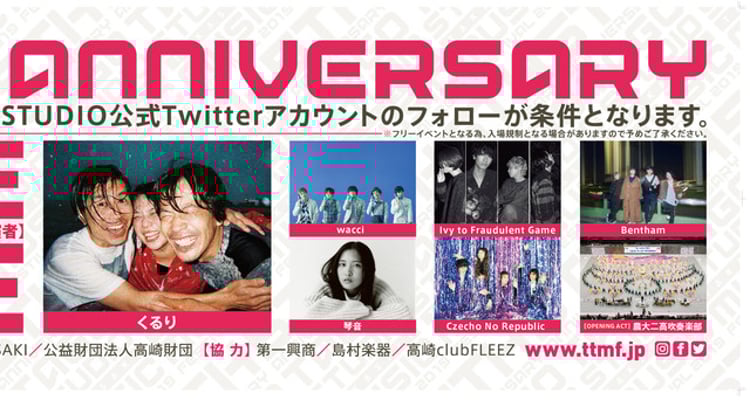 このイベントは、オープン5周年を迎える群馬県高崎市営のレコーディングスタジオ・TAGO STUDIO TAKASAKIが主催するもの。1日目はバンド・シンガーソングライター部門、カラオケ部門に分かれてのアマチュアオーディション、2日目はオーディションの優秀者やゲストアーティストが出演する入場無料のライブイベントが実施される。このうち2日目のイベントではくるり、Ivy to Fraudulent Game、Czecho No Republic、wacci、Bentham、琴音、オープニングアクトの農大二高吹奏楽部らがライブパフォーマンスを披露する。