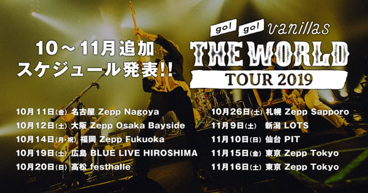 go!go!vanillasの全国ワンマンツアー「THE WORLD TOUR 2019」の追加スケジュールが発表された。