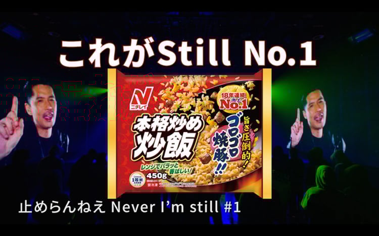 CMは欅坂46「黒い羊」の楽曲提供でも知られる音楽制作ユニット・ナスカがプロデュースした楽曲「PPCH」に合わせて、“踊り手”のみうめと仮面ライアー217がパラパラを踊るシーンでスタート。場面が暗転すると重いビートが鳴り響く中、スクリーンに大映しになったZeebraは、「本格炒め炒飯」が冷凍米飯類で18年連続売上No.1となっていることにかけて、「No.1」のワードが散りばめられた新曲「Still#1」を披露する。