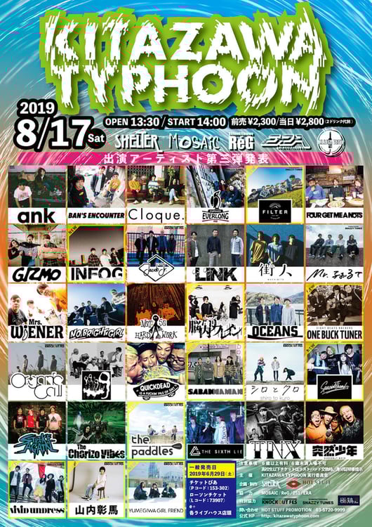8月17日に東京・下北沢のライブハウス5会場で行われるサーキットイベント「KITAZAWA TYPHOON2019」の出演アーティスト第3弾が発表された。