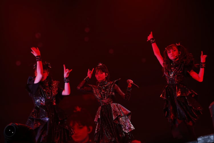 昨日のライブではまず、オーロラ色に輝く衣装を身に纏ったBABYMETALのSU-METALとMOAMETALが登場。歓声が沸き上がる中、3名のダンサーが現れるとそこから選ばれた1名のダンサーがSU-METALとMOAMETALに加わり、神バンドを従えてライブをスタートさせた。BABYMETALはタイの人気ラッパー・F.HEROをゲストに迎えて、新曲「PA PA YA!!(feat. F.HERO)」をお披露目するなど、「METAL GALAXY」収録の新曲を含めた全14曲を約1時間半のライブでパフォーマンスした。