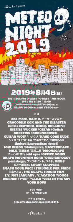 and more / CAR10 / チーターズマニア / CROCODILE COX AND THE DISASTER / cunts / DEATHRO / DMBQ / DREADEYE / EIEFITS / FUCKER / GEZAN / Gofish / GOREFRIX / GROUNDCOVER. / ギターウルフ / ハナクソ / HARD CORE DUDE / ヘテロ / 久土'N'茶谷 / カネコアヤノ / 小棚木もみじ / Limited Express (has gone?) / LOW VISION / Malimpliki / MASTERPEACE / MILK / 三沢洋紀 / 三輪二郎 / MOONSCAPE / ニーハオ!!!! / odd eyes / OFFICE VOIDS / OHAYO MOUNTAIN ROAD / OLEDICKFOGGY / penisboys / プンクボイシネ / ラミ子 / 柴田聡子 / 四万十川友美 / SLIGHT SLAPPERS / SMASH YOUR FACE / STRUGGLE FOR PRIDE / 田島ハルコ / THE GUAYS / TRAGIC FILM / T.V.not january / V/ACATION / VOGOS / WRENCH / やっほー / YALLA / YOLZ IN THE SKY / YOUR BOYS