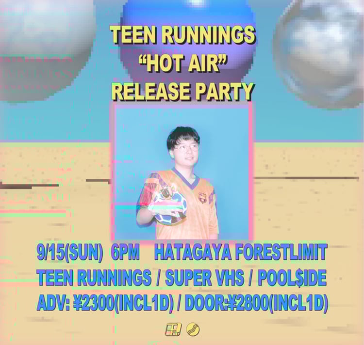 リリースパーティには本日7月24日にニューアルバム「Hot Air」をリリースしたTeen Runningsに加え、Super VHS、pool$ideもゲストして出演。チケット情報などの詳細はTeen RunningsのSNSでチェックしよう。
