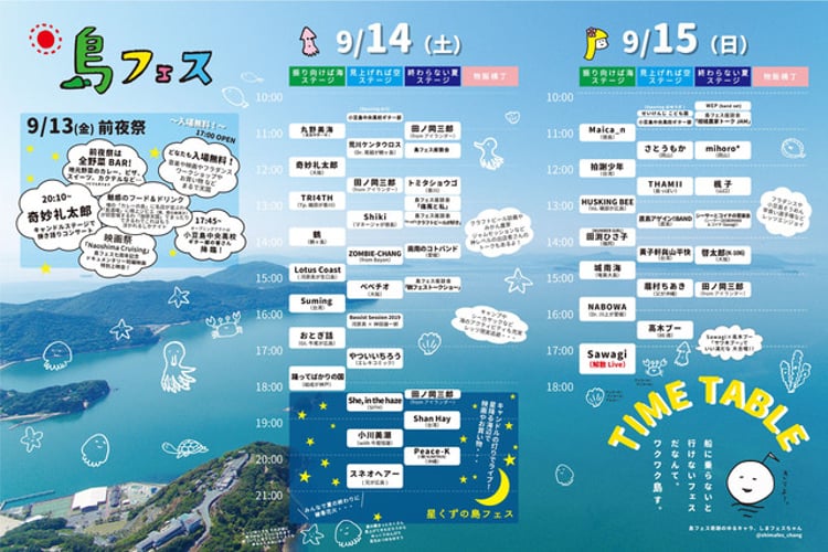 「振り向けば海 STAGE」「見上げれば空 STAGE」「終わらない夏 STAGE」の3つのステージが設置される「島フェス」。14日公演では踊ってばかりの国が「振り向けば海 STAGE」、スネオヘアーが「見上げれば空 STAGE」、(仮)ALBATRUSのPeace-Kが「終わらない夏 STAGE」、15日公演ではSawagiが「振り向けば海 STAGE」、高木ブーが「見上げれば空 STAGE」、田ノ岡三郎が「終わらない夏 STAGE」のトリを務める。また「島フェス」恒例となっている高木ブーのコラボレーション企画では、10月に解散することを発表しているSawagiとの「いい湯だな」が披露される。