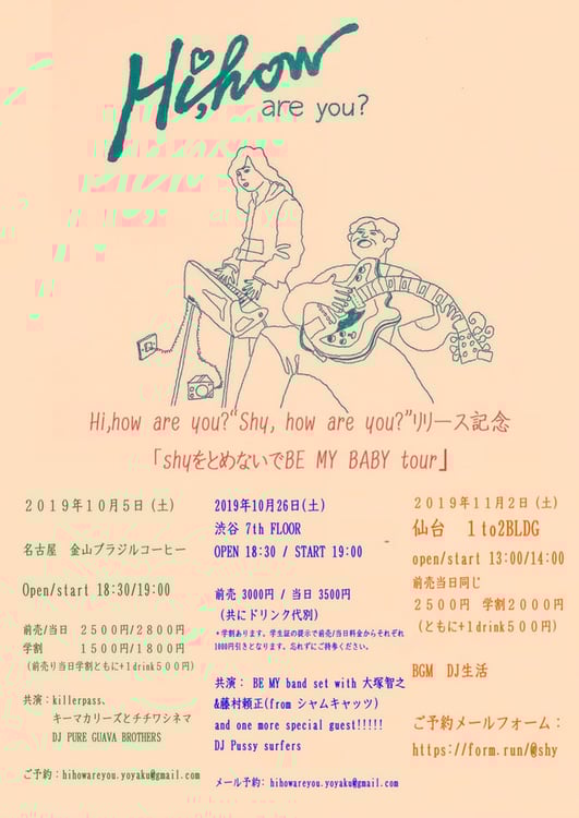 またアルバムのリリースを記念したツアー「shyをとめないでBE MY BABY tour」の開催も決定した。このツアーでは、10月5日に愛知・金山ブラジルコーヒー、26日に東京・渋谷7th FLOOR、11月2日に宮城・1TO2 BLDGの計3会場でライブが行われる。各公演のゲストとして、愛知公演にはKillerpass、東京公演にはBE MY band set with 大塚智之&藤村頼正(シャムキャッツ)などの出演が予定されている。なお宮城公演ではワンマンライブが行われる。