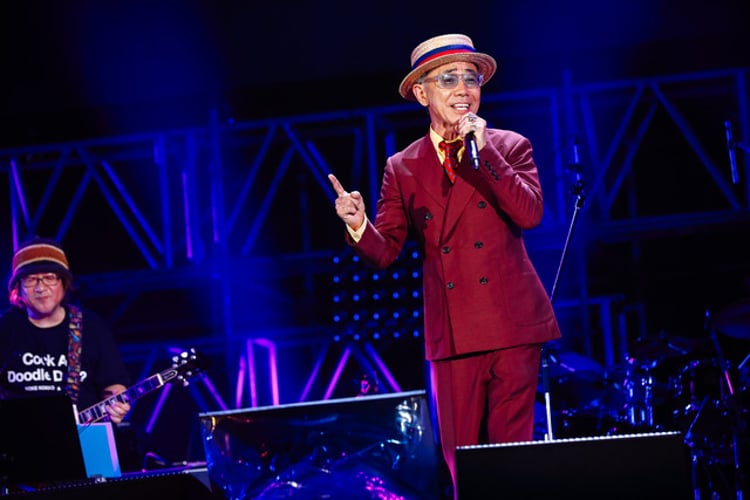 空に満月が浮かぶ中、初日の大トリである木梨憲武の出番に。えんじ色のスーツを着用した木梨はピアノの前に座り、甲高い声で「ミュージシャンに憧れてます」と矢野顕子「ラーメンたべたい」のカバーを“矢のり顕子”として歌唱。続いて“のり山良子”として「さとうきび畑の唄」「涙そうそう」を弦の張っていないギターを抱えながら歌い上げて、観客を爆笑させた。ここまでですでにカオスな状態だったが、彼は100人のパフォーマーたちを呼び込みオリジナル曲「Laughing days」と西城秀樹「YOUNG MAN(Y.M.C.A.)」をパフォーマンスしたかと思えば、「なぜかこの曲!」という紹介からアリスの「チャンピオン」をヒロミとカンニング竹山を迎えて披露。もはやすっかり予想不可能な状態になったところで、木梨はユニバーサルミュージックとの契約告知を織り交ぜながら、新曲「GGスタンダップ」で低くダンディな歌声を聴かせる。さらに木梨は、妻である安田成美への感謝の思いをつづったラブソング「I LOVE YOU だもんで」で目の前の観客をほっこりさせた。