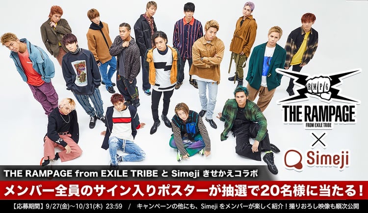 THE RAMPAGE from EXILE TRIBEとスマートフォン向けキーボードアプリ「Simeji」のコラボキャンペーンが本日9月27日にスタートした。