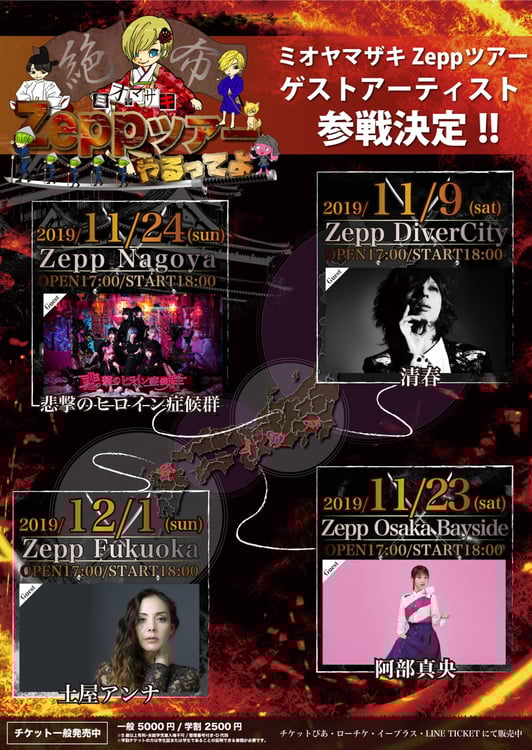 「ミオヤマザキZeppツアーやるってよ。」は11月9日の東京・Zepp DiverCity TOKYOを皮切りに、全国4都市のZeppで行われるツアー。東京公演に清春、大阪公演に阿部真央、愛知公演に悲撃のヒロイン症候群、福岡公演に土屋アンナが出演する。チケットは各プレイガイドにて販売中。