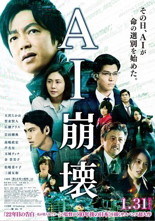 「AI崩壊」は、社会派サスペンス映画「22年目の告白 ―私が殺人犯です―」の入江悠が監督、脚本を担当した作品。AI社会を舞台にした完全オリジナル脚本のサスペンス映画となっており、大沢たかお、賀来賢人、広瀬アリス、岩田剛典(EXILE、三代目 J SOUL BROTHERS from EXILE TRIBE)、高嶋政宏、芦名星、玉城ティナ、余貴美子、松嶋菜々子、三浦友和ら個性豊かなキャストが集う。