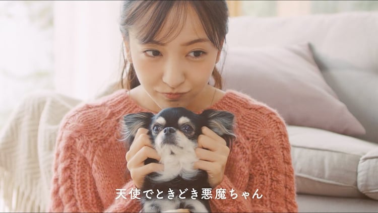 大の犬好きで自身もトイプードルを飼っている板野。映像ではチワワのラムネ、ジャックラッセルテリアのてん、ブルドッグのアモーレ、柴犬のななと共演している。