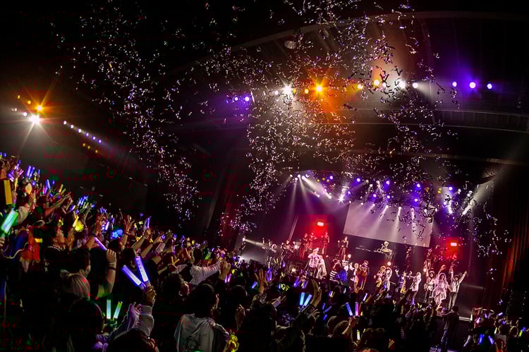 そしてイベントはGARNiDELiAによるライブのブロックへ。MiA(MEJIBRAY)をギターに迎えた2人は「夜咄ディセイブ」「daze」といったアッパーチューンを連発する。「Hysteric Bullet」ではみうめ、217、アナタシアがダンスで参加し、GARNiDELiAのステージに華を添えた。最後は全出演者によってGARNiDELiAの代表曲の1つ「極楽浄土」がパフォーマンスされ、各アーティストのファンが入り乱れるフロアが1つに。メイリアは「もうすごい大変だったんですけど、今日みんなの笑顔を見ることができてめちゃくちゃ楽しかったので、また来年もやっちゃうなこれは」と満足気な表情を浮かべたあと、GARNiDELiAのオフィシャルモバイルファンクラブ「G-PLANET」がオープンすること、来年1月より全国ツアー「GARNiDELiA 10th ANNIVERSARY stellacage tour 2020『star trail』」を開催することを発表。「これからも全速力で突っ走ってまいりますので、GARNiDELiAのことをよろしくお願いします!」と観客に呼びかけ、ハロウィンパーティを締めくくった。