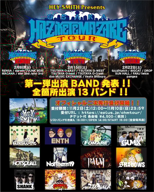 HEY-SMITH / FOMARE / GUMX / SHADOWS / PALM / ENTH / SHIMA / HOTSQUALL / dustbox / 山嵐 / SHANK / waterweed / Northern19 / and more