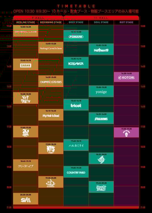 My Hair is Bad / クリープハイプ / ハルカミライ / SiM / SHANK / yonige / KOTORI / FOMARE / 04 Limited Sazabys / HEY-SMITH / Nothing's Carved In Stone / COUNTRY YARD / Crystal Lake / NAMBA69 / NOISEMAKER / Northern19 / SHADOWS / EGG BRAIN / FOR A REASON / tricot / MAN WITH A MISSION / MY FIRST STORY / ROTTENGRAFFTY