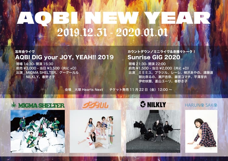 15:30スタートの「AQBI DIG your JOY, YEAH!! 2019」にはMIGMA SHELTER、グーグールル、NILKLY、春野さ子が出演。それぞれがライブを行うほか、楽曲を交換してパフォーマンスする企画も行われる。22:00から年またぎで行われる「Sunrise GIG 2020」にはAQBI所属アイドルのうち成人メンバーのみが出演。ミニライブやトークを繰り広げる。