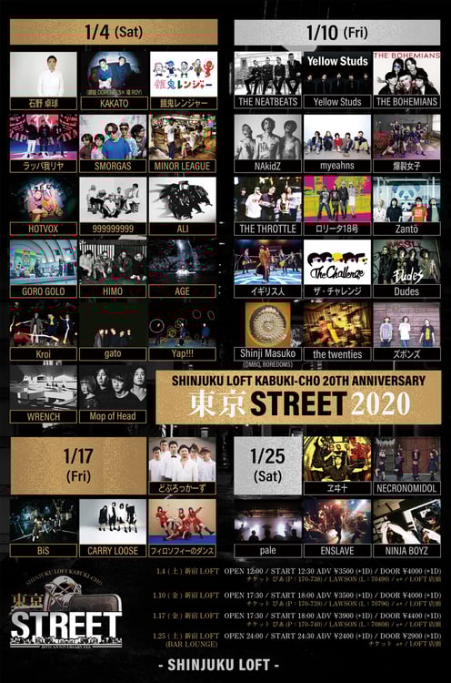 東京・新宿LOFTの歌舞伎町移転20周年を記念したライブイベント「東京STREET2020」が、2020年1月4日、10日、17日、25日の計4日間にわたって新宿LOFTで開催される。