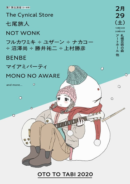 「OTO TO TABI」は“北海道の冬に音楽フェスを”という思いから、音楽好きが集まって2011年にスタートさせたイベント。10回目となる来年はThe Cynical Store、七尾旅人、NOT WONK、フルカワミキ÷ユザーン÷ナカコー÷沼澤尚÷勝井祐二÷上村勝彦、BENBE、マイアミパーティ、MONO NO AWAREが第1弾としてラインナップされた。