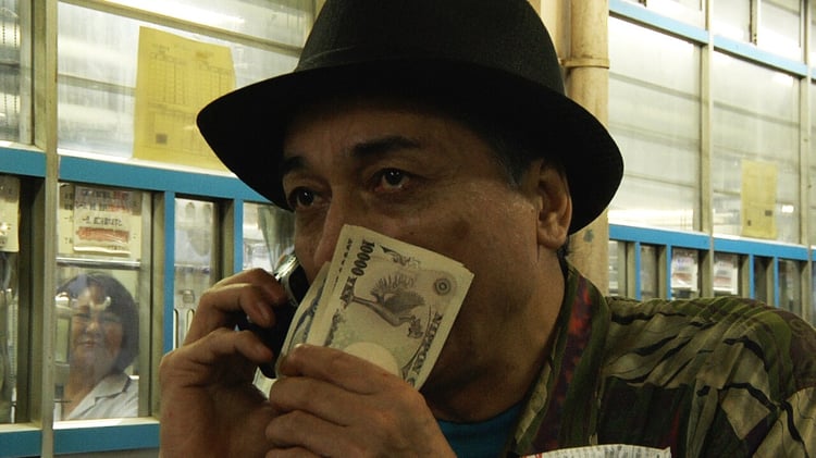 20年以上に渡って競輪にのめり込み、撮影当時大学生だった四男を競輪場に連れ出して指南したり、「競輪が病気なら、生涯、治らないでほしい」と豪語するほど熱中している友川。基本的に大穴狙いで、競輪仲間にはめったに当たらないと言われている彼だが、それでも1日の大半の時間を競輪場に出向くか、あるいは家でのレース予想に割いている。