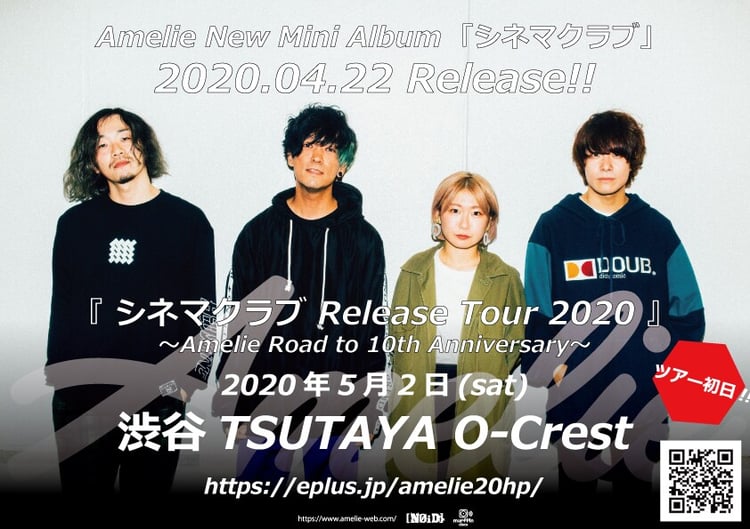 Amelieは新作を携え、リリースツアー「シネマクラブ Release Tour 2020 ~Amelie Road to 10th Anniversary~」を開催。このツアー名にはAmelieが2021年に結成10周年を迎えるため、「~Amelie Road to 10th Anniversary~」というサブタイトルが付いている。現時点でツアー初日となる5月2日の東京・TSUTAYA O-Crest公演のみスケジュールが解禁されており、初日公演のチケットはイープラスで先行予約申し込みを受付中。