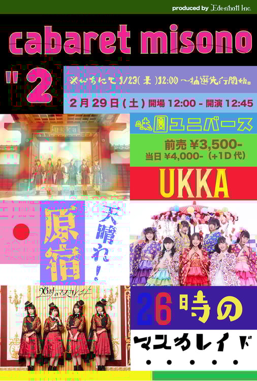 「cabaret misono」はイベントの企画・主催を行うEdenhall Inc.が同会場で実施する対バン企画。2月29日の昼に開催される「cabaret misono"2」にはukka、天晴れ!原宿、26時のマスカレイド、29日の夜に開催される「cabaret misono-lila-」には二丁目の魁カミングアウト、眉村ちあきが出演し、3月1日の「cabaret misono"3」はukka、二丁目の魁カミングアウト、眉村に加え、大阪☆春夏秋冬、フィロソフィーのダンスが出演者に名を連ねる。チケットぴあでは2月2日23:59までチケットの先行抽選申し込みを受付中。一般販売は2月8日12:00にスタートする。