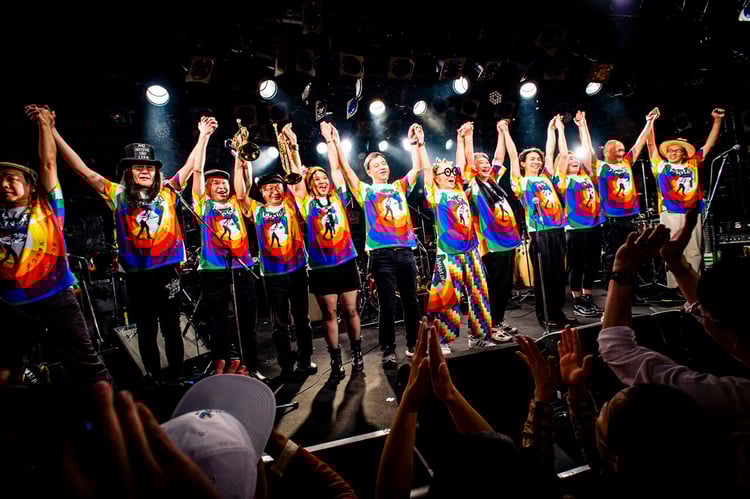 アンコールの「みんなたちのファンファーレ」では、開演前に配布された虹色の旗がフロア中を埋め尽くし、会場はピースフルな雰囲気に。そして最後の楽曲に選ばれた「もうがまんできない」ではゲスト全員がステージに集結。心地よく開放感あふれるサウンドに合わせて「心のもちようさ」の大合唱が繰り広げられ、アケミの30年目の命日は、多くのフォロワーたちの愛に満ちた一夜となった。