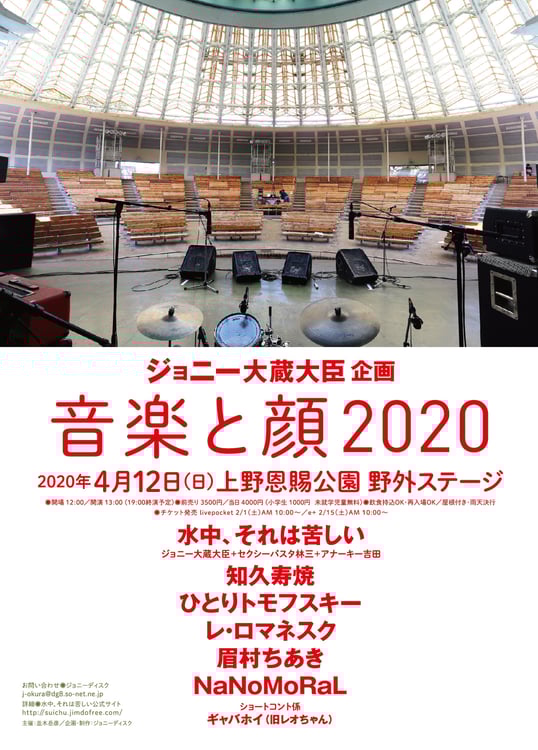 水中、それは苦しいのジョニー大蔵大臣(Vo, G)が企画するライブイベント「音楽と顔2020」が、4月12日に東京・上野恩賜公園野外ステージで行われる。
