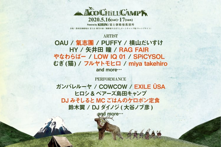 5月16、17日に静岡県御殿場市の富士山樹空の森および御殿場やまぼうしオートキャンプ場で開催されるライブイベント「ACO CHiLL CAMP 2020 powered by KIRIN / 富士山御殿場蒸溜所 ~アソブ、オドロク、フジサン、キャンプ。~」の出演アーティスト第3弾が発表された。