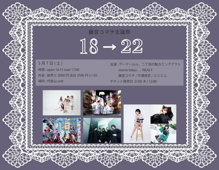 グーグールルの藤宮コマチの生誕記念イベント「18→22」が3月7日に東京・UNITで開催される。