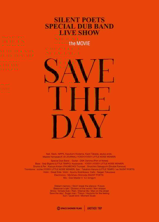 「SAVE THE DAY」は、2019年に劇場公開されたライブ映画。SILENT POETSの12年ぶりのオリジナルアルバム「dawn」の発売を記念して2018年6月に東京・WWWで開催された初のバンドセットワンマンライブの模様が収められている。この日の公演は、5lack、NIPPS(BUDDHA BRAND)、こだま和文、武田カオリ、asuka ando、山崎円城(F.I.B Journal)、YOSSY(YOSSY LITTLE NOISE WEAVER)らを迎えて行われた。