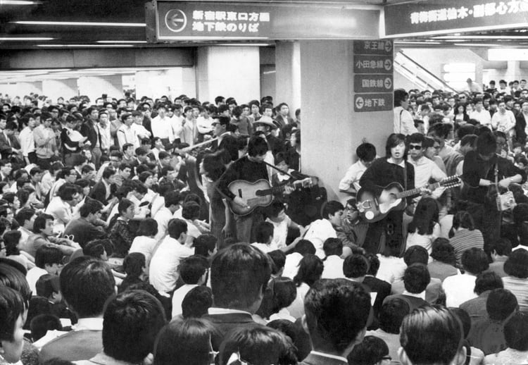 こうした学生運動の盛り上がりやプロテストフォークのブームを象徴するのが、1969年2月末から7月にかけての土曜日、新宿西口地下広場に多いときで数千人の若者が集まっておこなわれていた「フォークゲリラ集会」だった。主催は、ベ平連(ベトナムに平和を!市民連合)の若者たち有志であった。参加者はフォークゲリラと呼ばれる歌い手たちと共に、さまざまな反戦 / プロテストソングを合唱した。高石友也の代表曲「受験生ブルース」(68年発表)の替え歌「機動隊ブルース」(作詞は東京ベ平連のメンバーだった大川正一とされる)や、時の総理大臣・佐藤栄作(現首相安倍晋三の大叔父)を茶化した「栄ちゃんのバラード」(佐藤は「栄ちゃんと呼ばれたい」と言って、国民から親しまれることを望んだ。そのことを揶揄して作られたもの。作者は南大阪ベ平連)などが、岡林の「友よ」や革命歌「インターナショナル」、アメリカのプロテストソング「We Shall Overcome」などと共に歌われた。同様の集会は全国各地で行われていた。しかし、膨れあがるばかりの参加者に市民の自然発生的なエネルギーを警戒した当局は5月に機動隊を導入し参加者を排除。人々が集まって歌を歌う、ただそれだけのことが抑圧の対象になった。そして69年6月28日、参加者と機動隊が衝突、道路交通法が適用されて64名が逮捕された。7月14日の集会を最後に西口広場は西口通路と名称変更され、以降一切の集会は禁止され、フォークゲリラ集会は一気に終息した。ちなみ1990年代に入ると、西口通路はホームレス強制排除事件の舞台ともなっている。(※参考資料:大木晴子・鈴木一誌編著「1969―新宿西口地下広場」新宿書房)