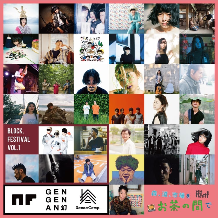 「森、道、市場をお茶の間で」では、チケット制の有料配信と無料配信の内容が異なるプログラムを用意。有料配信には「森、道、市場 2020」に出演予定だったアーティストより、15日はカジヒデキ、bird、坂本美雨、Campanella、畳野彩加(Homecomings)、玉置周啓(MONO NO AWARE)、VenueVincent、16日は田島貴男(ORIGINAL LOVE)、石毛輝(the telephones)、辻村豪文(キセル)、眉村ちあき、呂布カルマ、ZOMBIE-CHANG、エンヤサンとMZP、ジョニー大蔵大臣(水中、それは苦しい)、Jin Dogg、butaji、17日はカネコアヤノ、Keishi Tanaka、釈迦坊主、青谷明日香、the chef cooks me、原田茶飯事、三輪二郎、YOU$UKE YUK1MAT$U、Ryu(Ryu Matsuyama)が参加する。また5月5日に配信されたオンラインフェス「BLOCK.FESTIVAL Vol.1」の一部アーカイブ映像も公開される予定だ。