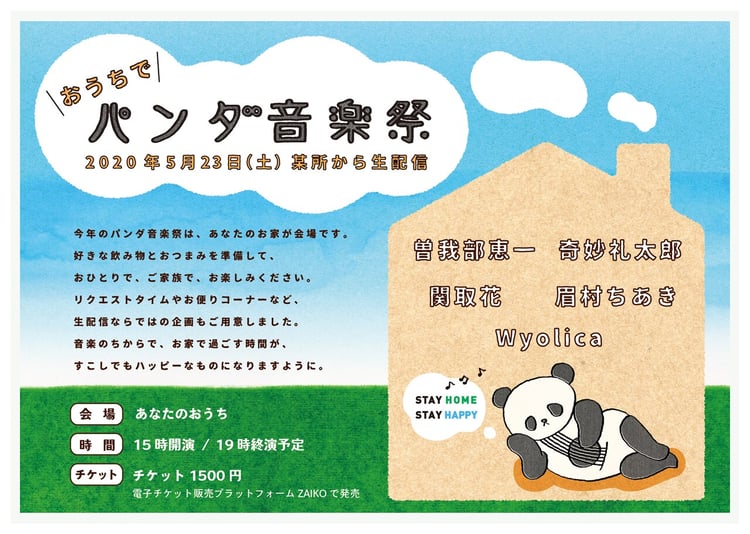 「パンダ音楽祭」は“都会の音楽ピクニック”をテーマに掲げ、2012年より毎年行われてきたイベント。今回は新型コロナウイルス感染拡大の影響で上野恩賜公園での開催を断念し、別会場からライブの模様を有料配信する。出演者は曽我部恵一(サニーデイ・サービス)、奇妙礼太郎、関取花、眉村ちあき、Wyolica、藤岡みなみ。彼らのライブに加え、視聴者からのメッセージを紹介するコーナーや、「リクエストコーナー」「ZOOMで飛び入り参加コーナー」も展開される。