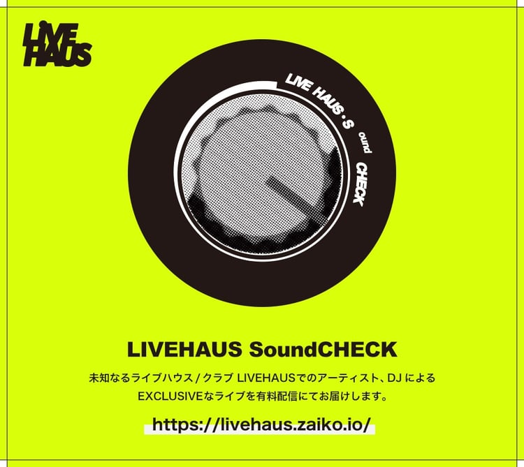 LIVE HAUSは本来4月のオープンに向けて設営準備が進められていたが、新型コロナウイルス感染拡大に伴う諸問題によりオープンは延期となっている。「LIVEHAUS SoundCHECK」はオープン前のLIVE HAUSを舞台にアーティストやDJが行ったパフォーマンスを、電子チケット販売プラットフォームのZAIKOを通して視聴者に配信する企画。配信で得た収益はアーティスト、撮影クルー、LIVEHAUSの3者に均等に分配される。